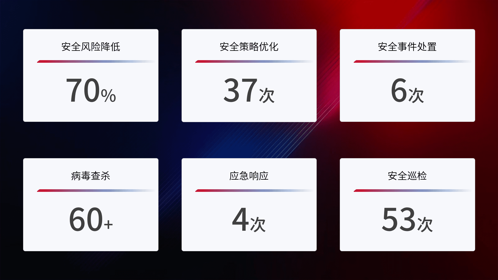 提供全面的安全事件报告体系,,,包括处置报告、、周报、、、、季度和年度总结,,,结合持续监控,,帮助客户深入了解网络安全状况。。
